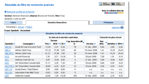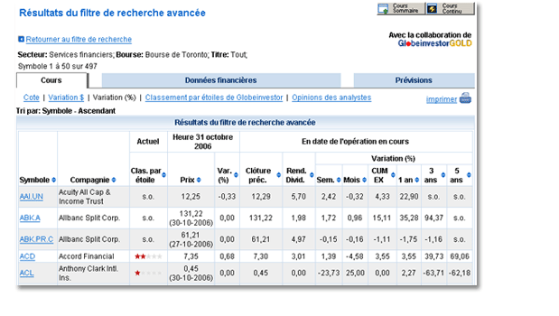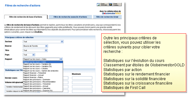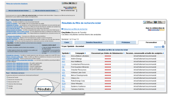 BMO Ligne d’action s’est associée à GlobeinvestorGOLD pour vous offrir des filtres de recherche d’actions encore plus performants. Ces outils simples mais puissants vous aident à cibler rapidement votre recherche parmi les titres de sociétés canadiennes et américaines que nous surveillons.